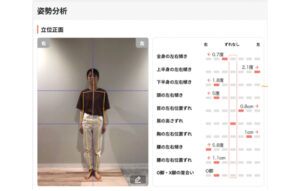 数枚の全身写真を撮影するだけで、最新のAI姿勢分析システムが体のどの部分がどれだけ歪んでいるかを可視化。BeforeーAfterの違いも確認できます。また、ご自分のスマホでも確認できるので、生活習慣の見直しにも便利です。
